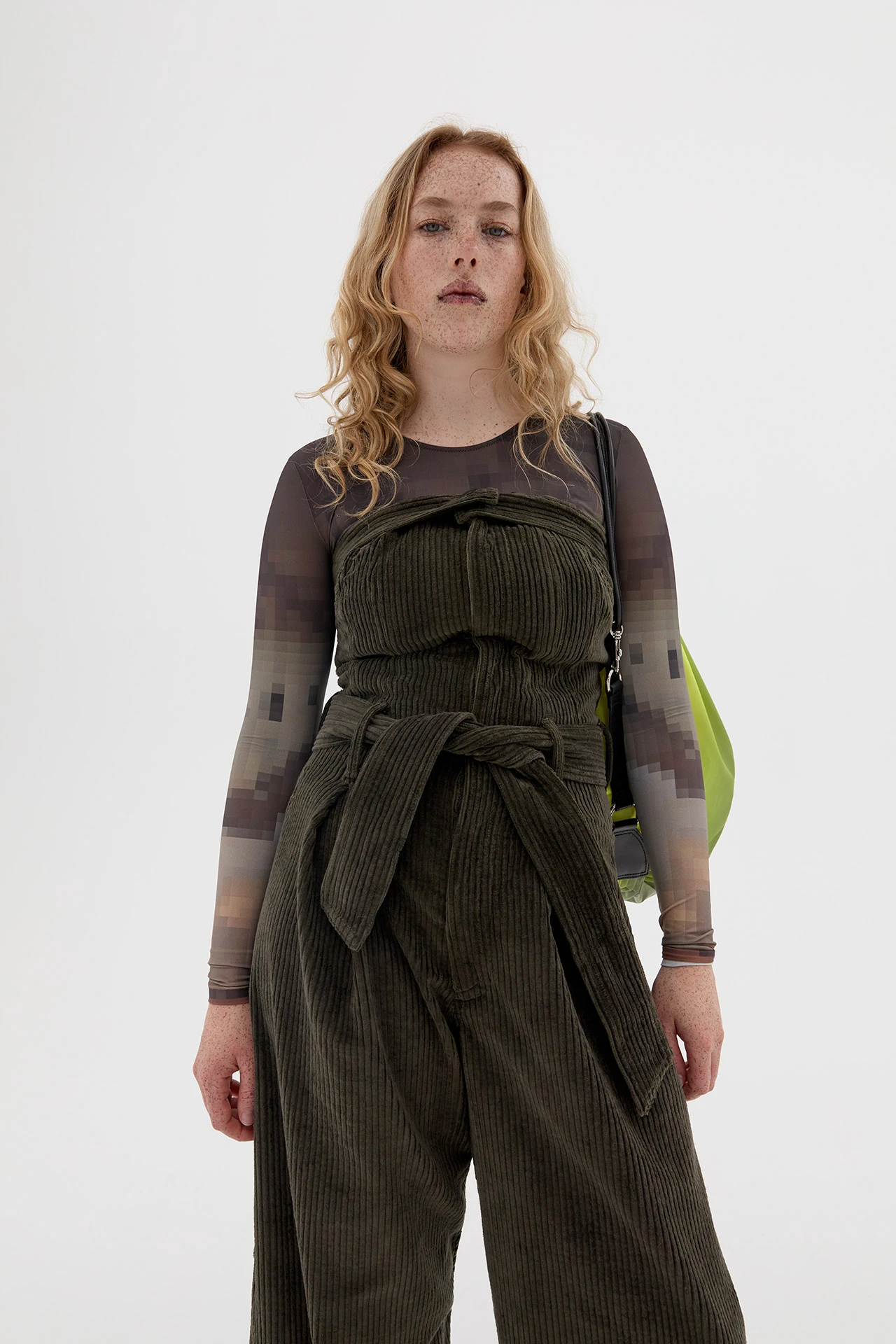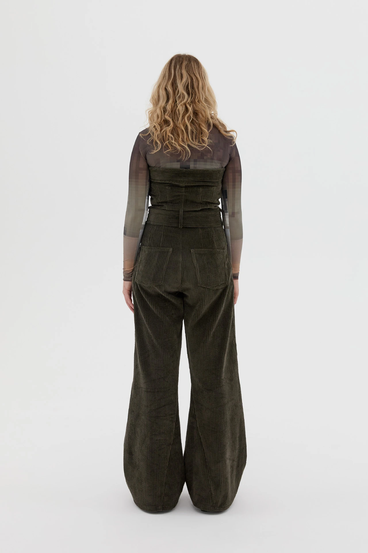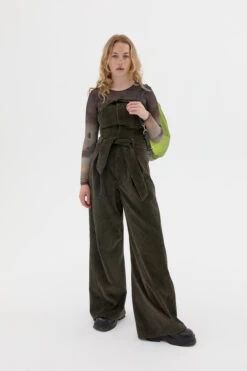 A classic flared jumpsuit which fits slim through the structured bodice and the tie-around the waist. Handcrafted on the body with a deep khaki corduroy to achieve the desired fit and shaping using twisted seams. The unusually thick denim in a bespoke wash offers a distinct luxury approach to a timeless classic. This style is true to size. We recommend selecting your standard European size. Designed in London | Handcrafted in Spain
