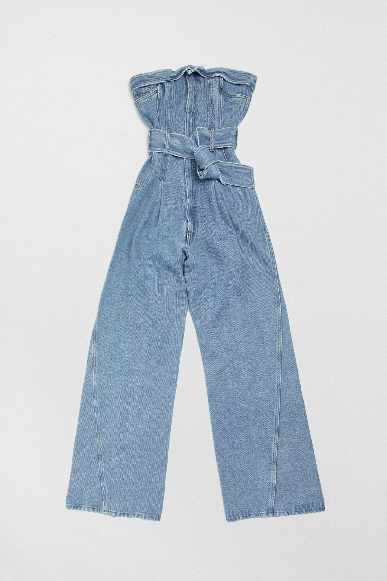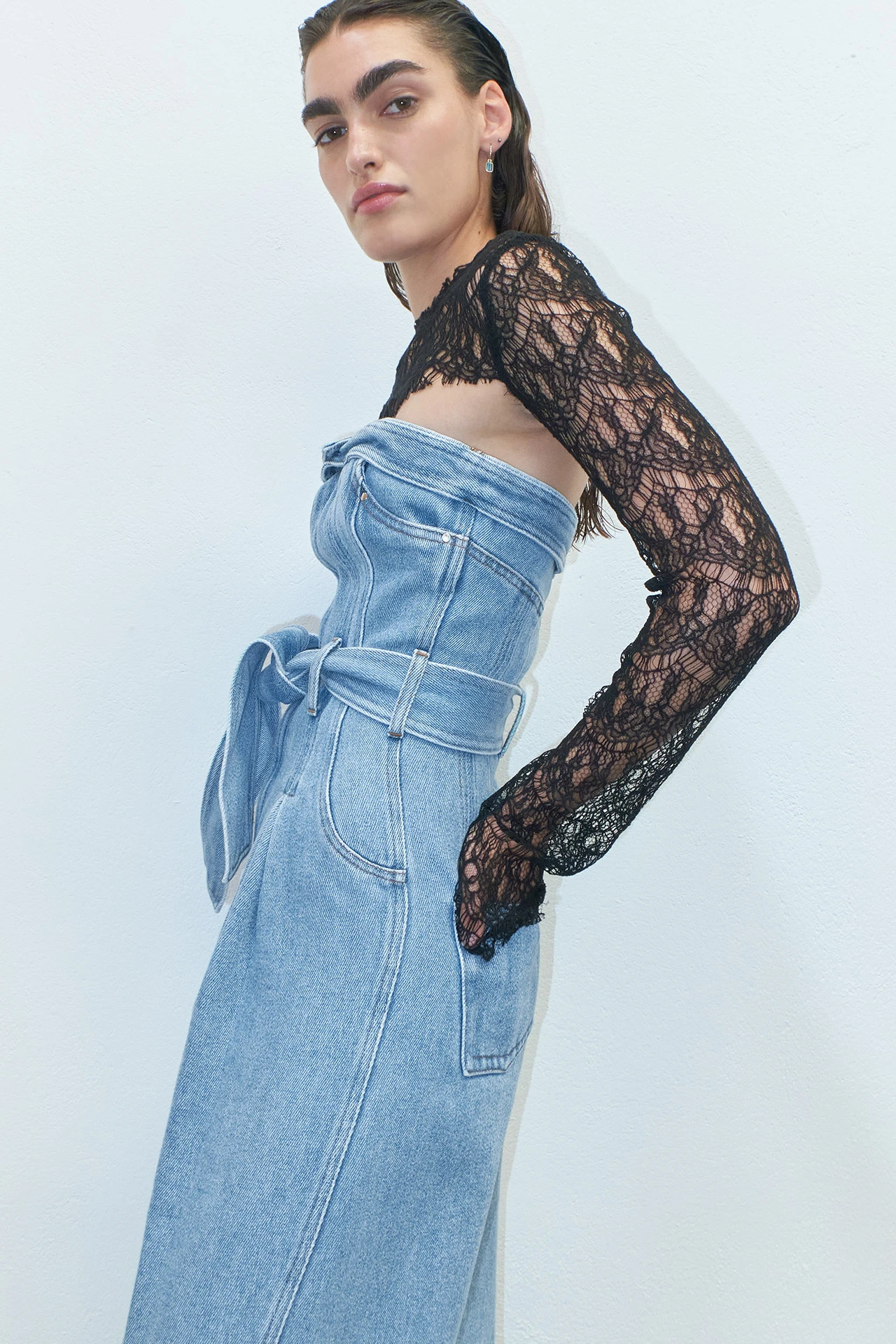 In Japanese Kuroki denim, Pola strides across the floor. You step into her world and she pulls you in at the waist. She embraces you, reaching under the arms and right around the upper torso, pulling you in. Pola zips, belts, and buttons you up – she was handcrafted on the body to achieve the desired fit and shaping using twisted seams.