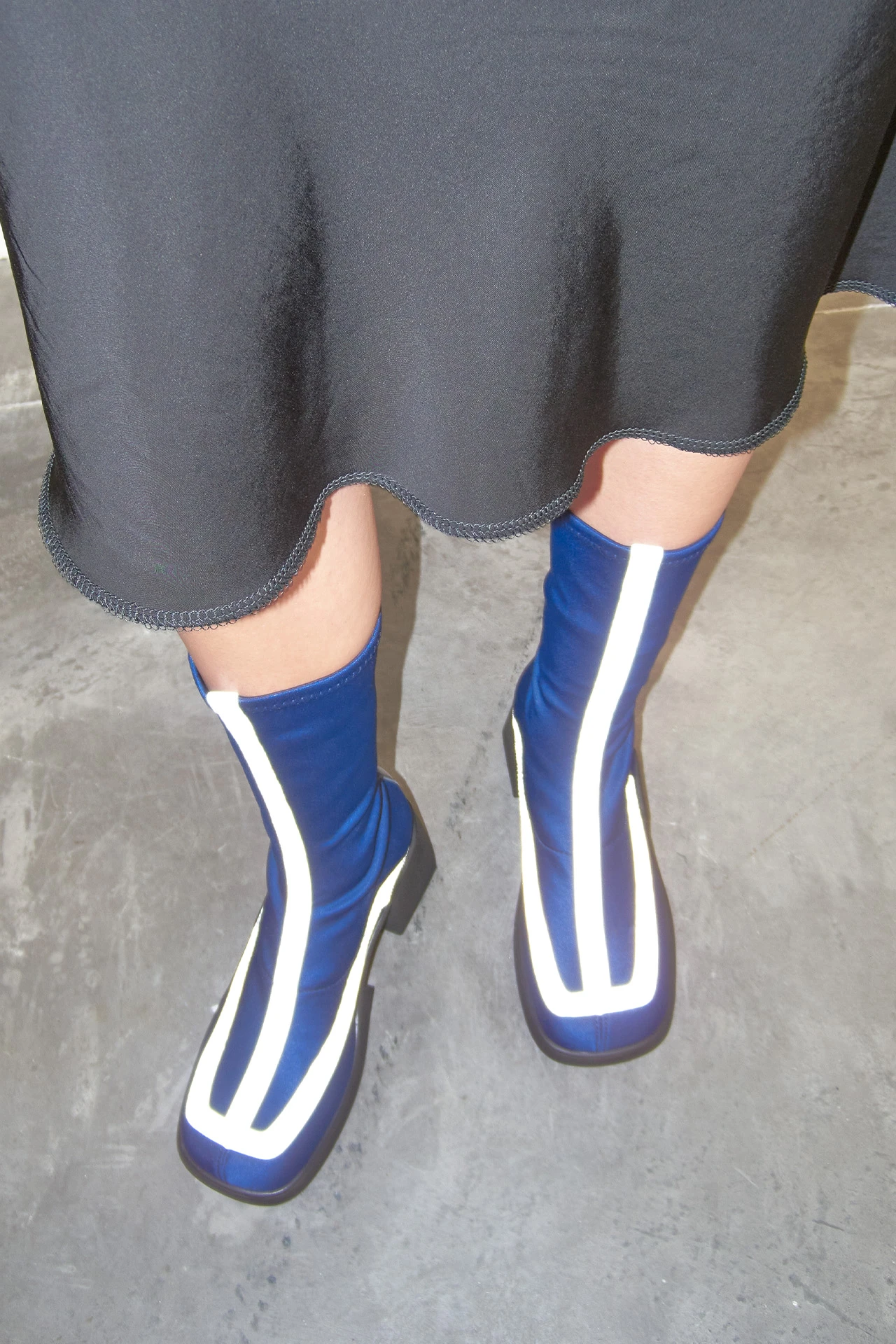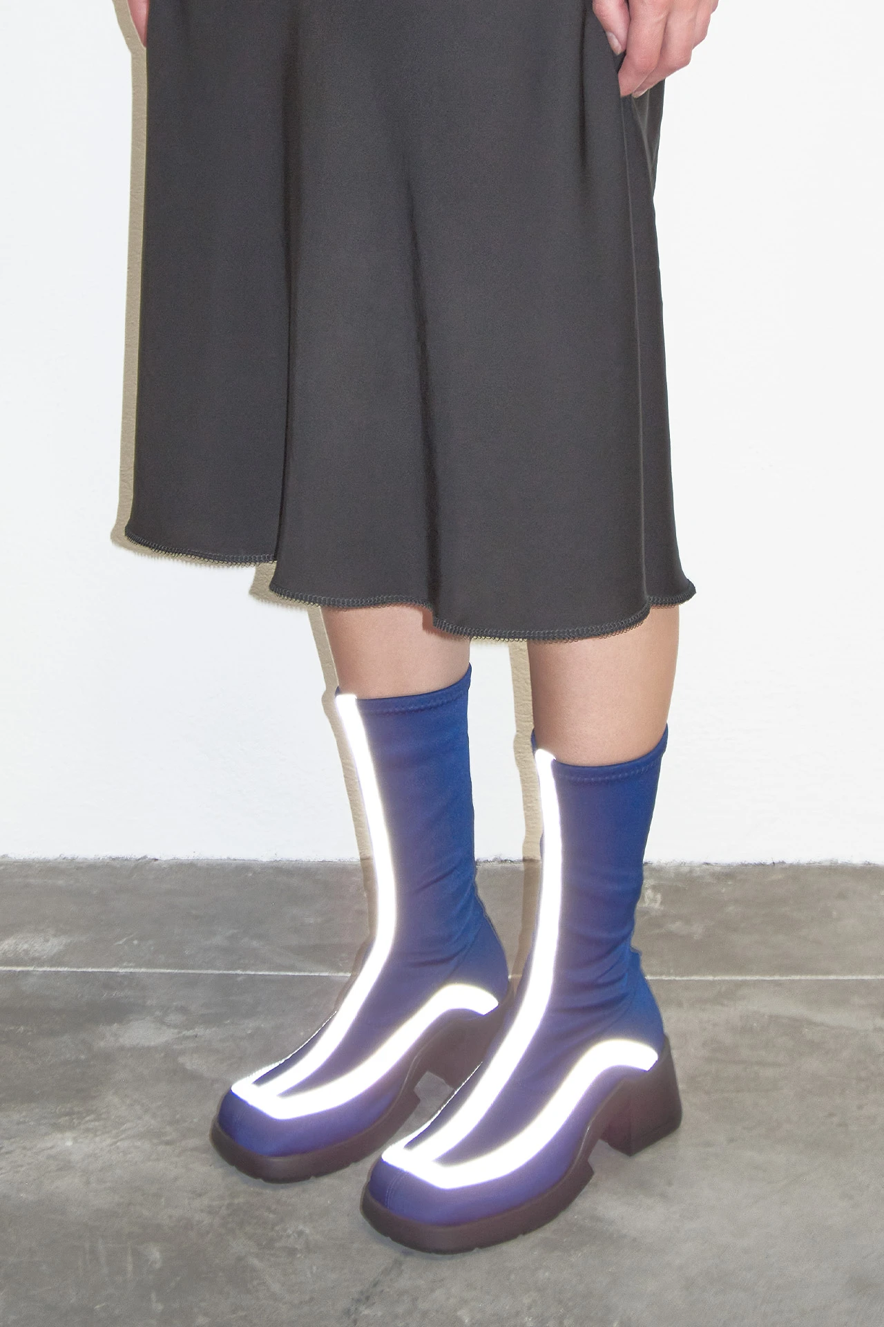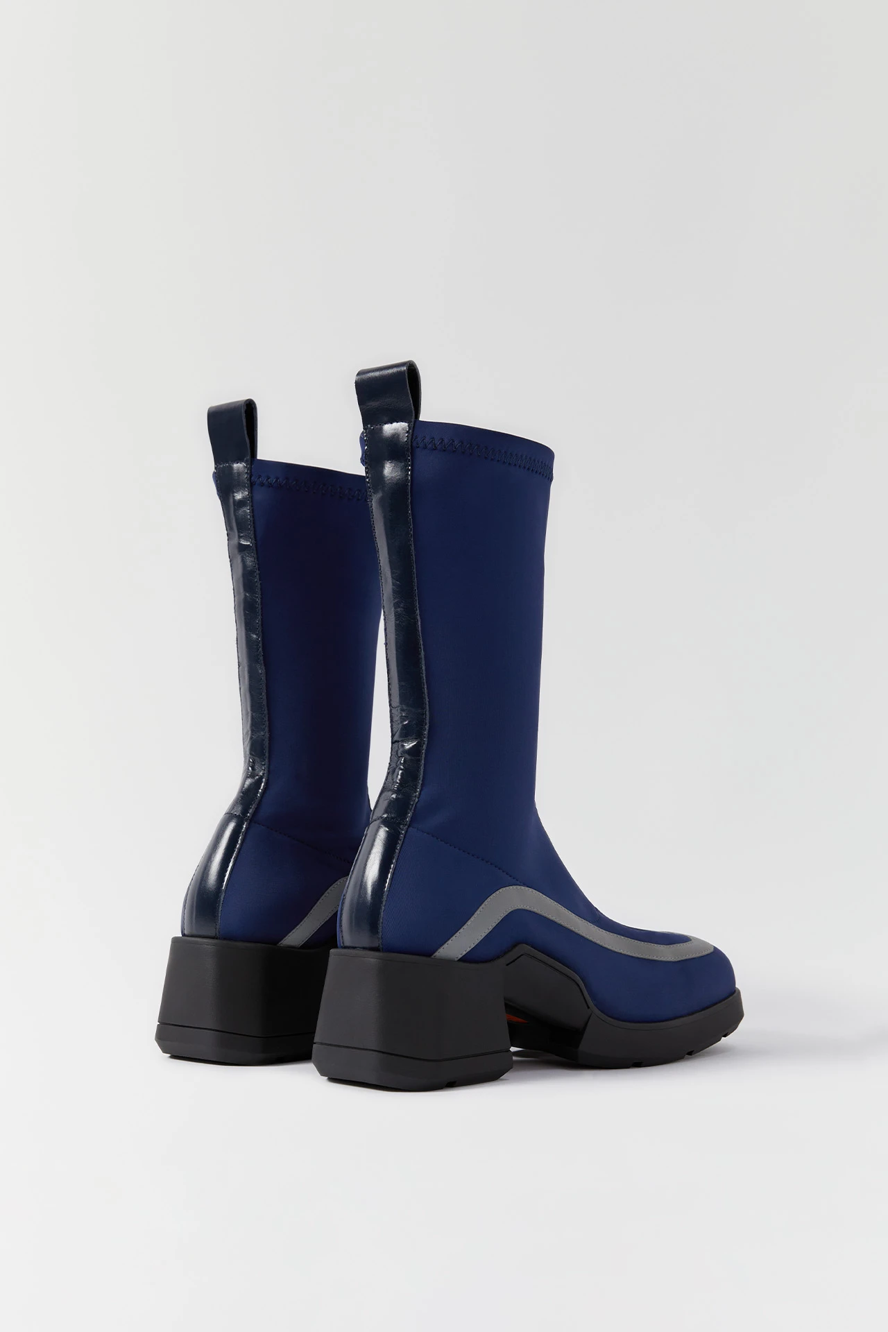 Shawna is a stretch lycra slip-on boot inspired by 1970s motor-racing boots that features two slim stripe panels of reflective grey textile (see them shine under flashlight!). Stride with speed in these sporty chunky soles that boast cubic chiselled sections and an E8 logo tread sole.