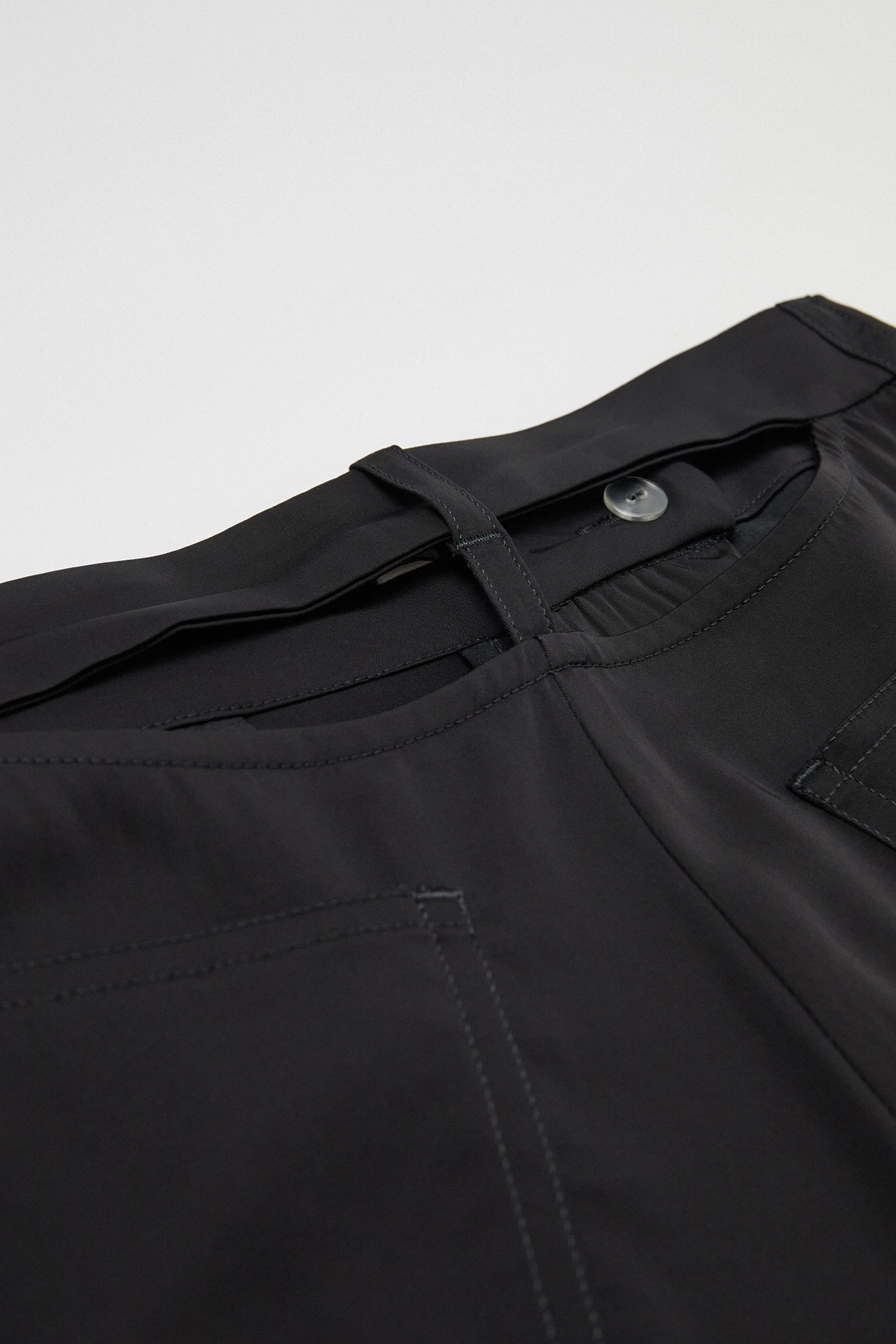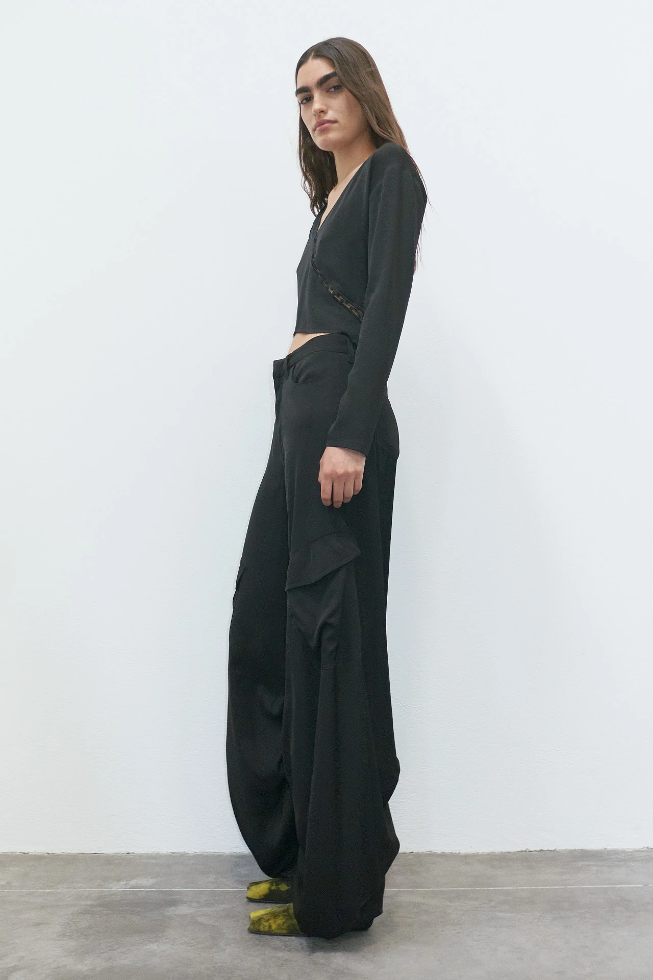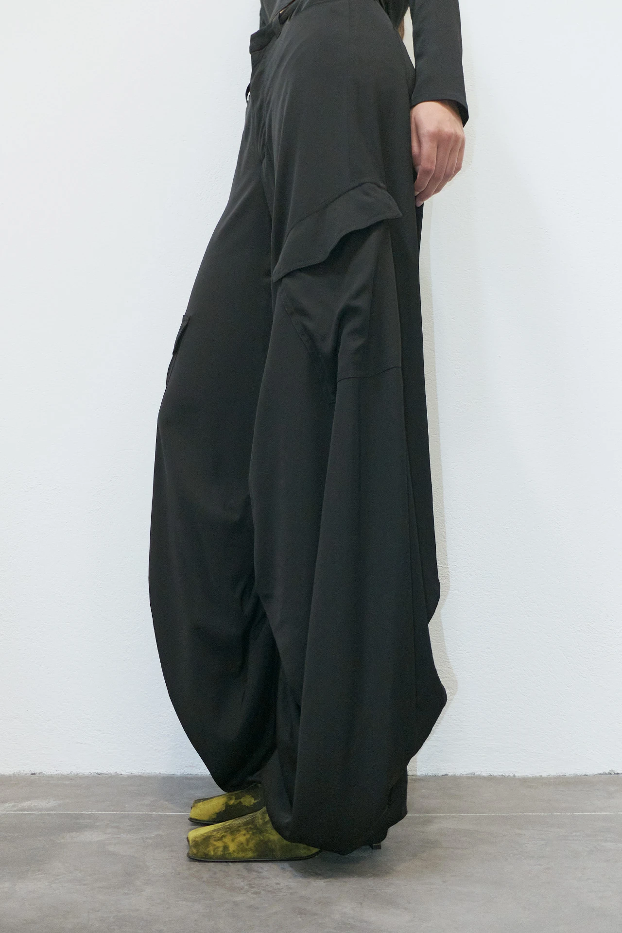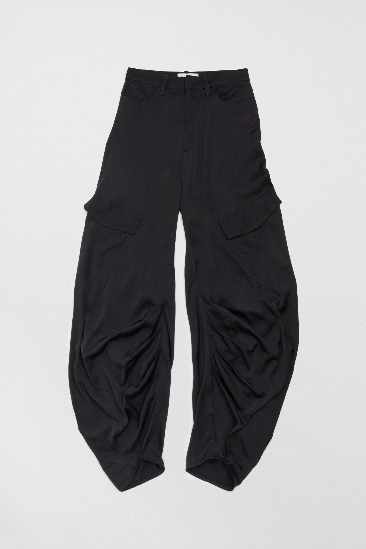 Sibuca takes the mixed stylistic messages of multiple eras gone by, then stitches them back together to form a trouser for today. From her snug high waistline, she barrels outwards with pronounced seams and mid-leg pockets, before turning back in again to meet an almost-cuffed hem to the ankle. The inner leg features ruched detailing, nodding to the romantic tailoring of the late mid-century and the mid-nineties’ cargo pant infatuation all in one move.