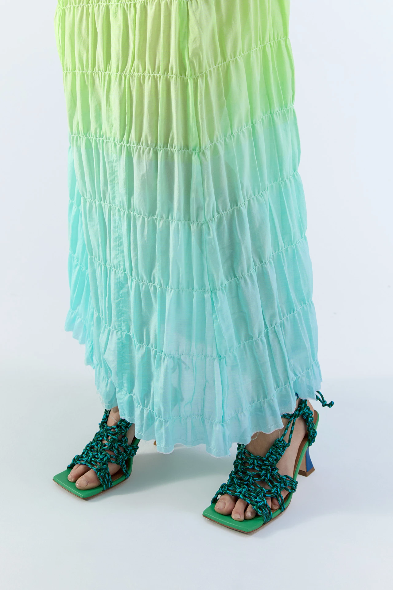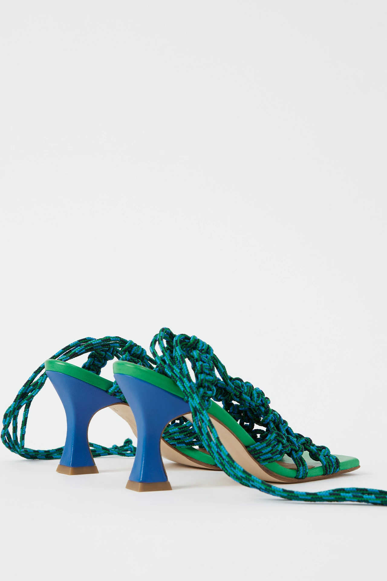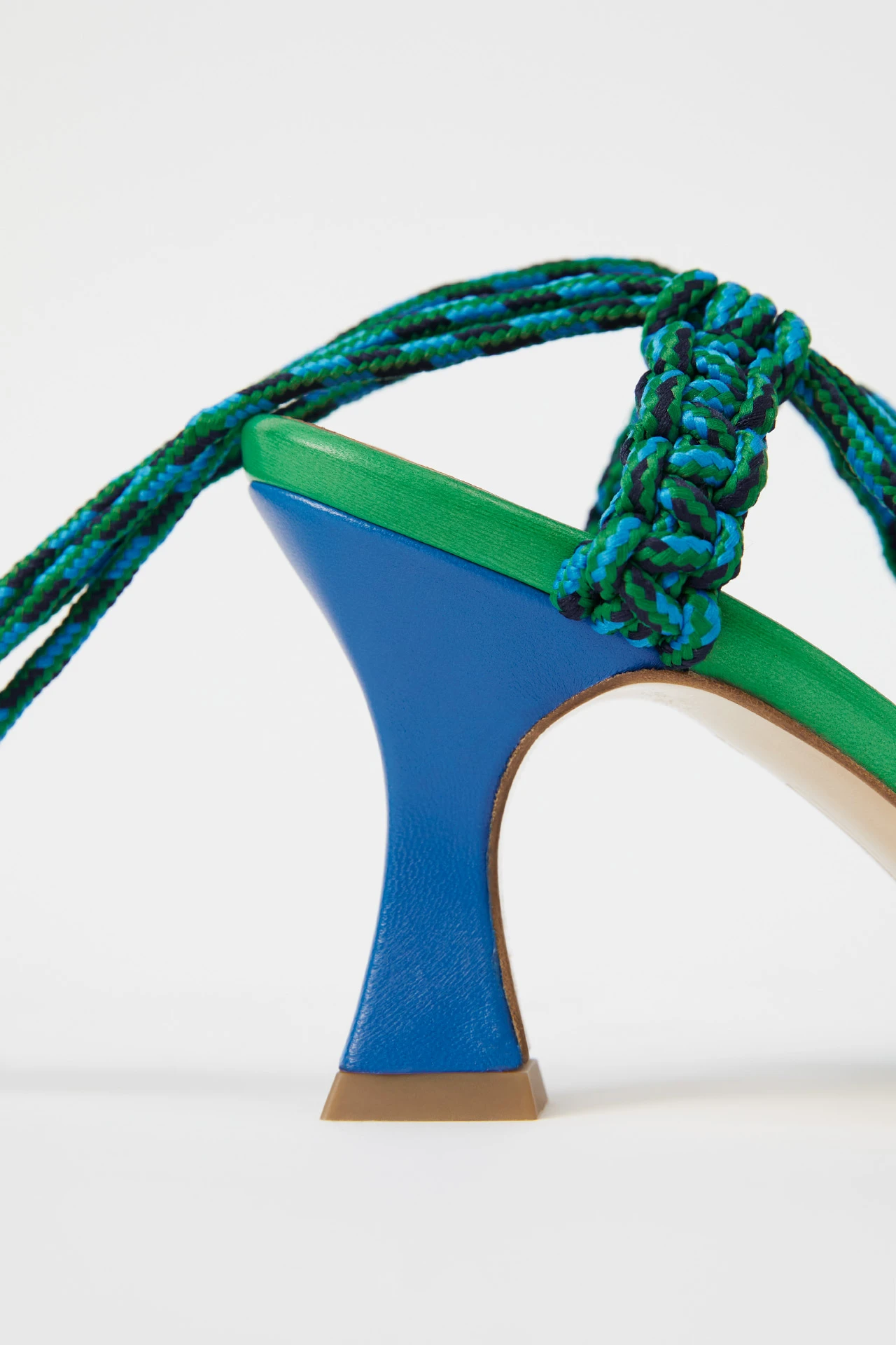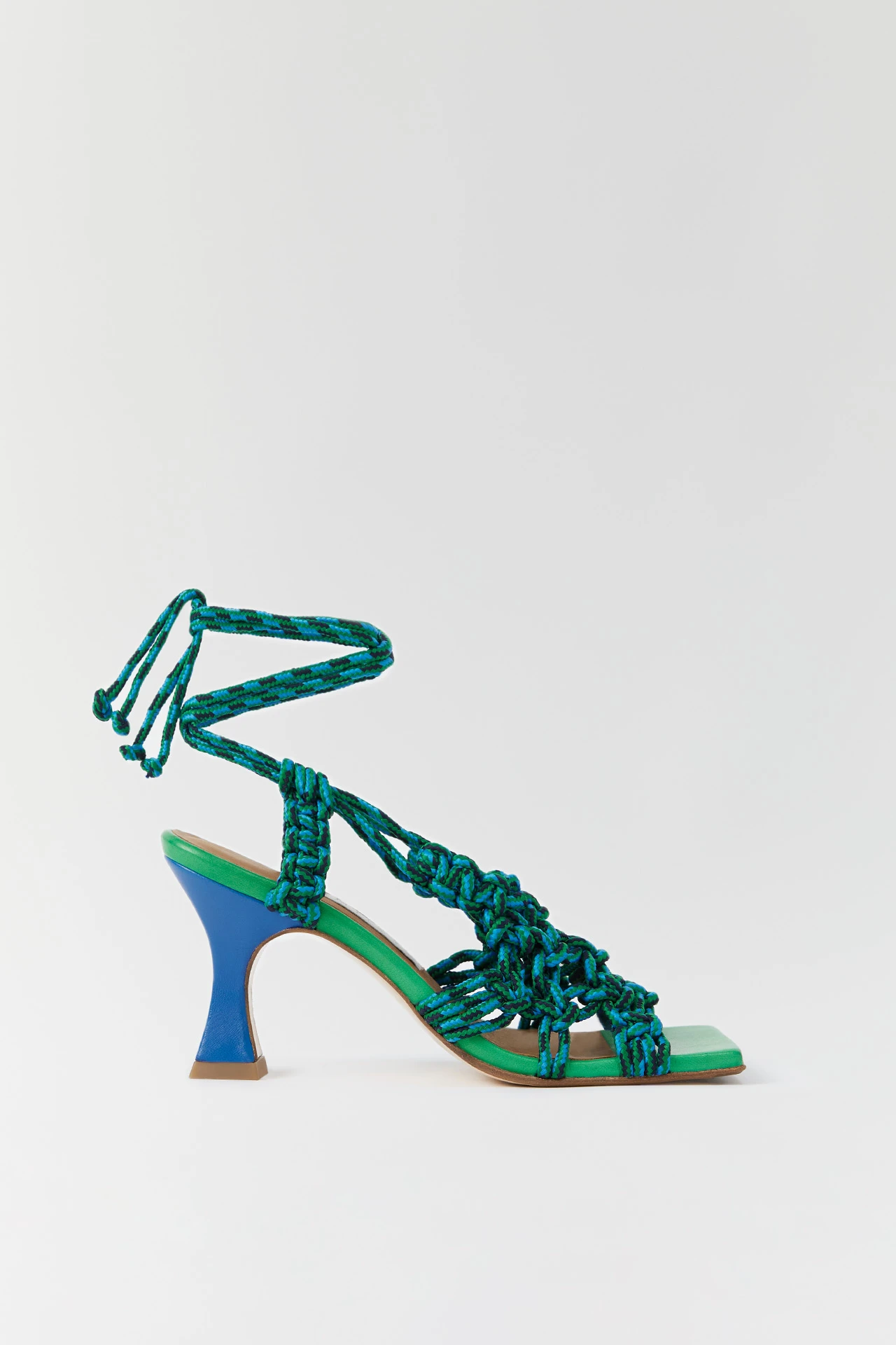 Some sandals fade, but Stephanie’s Icon status sustains. And quite right, too. Atop a blue lambs leather covered flared heel and green square-toed slimline cow leather outsole, her upper is formed of macrame knotted shoelaces in contrasting green, blue, and black – tied typically to the rear, or however you see fit. As with all Icons, Stephanie is finished with memory foam insoles and vegetable tan cow leather lining for enhanced comfort, plus a rubber heel cap and rubber-invected toe on her vegetable tan cow leather sole for durability. This style is true to size. Heel Height 7,5cm We recommend selecting your standard European size. Designed in London | Handcrafted in Spain