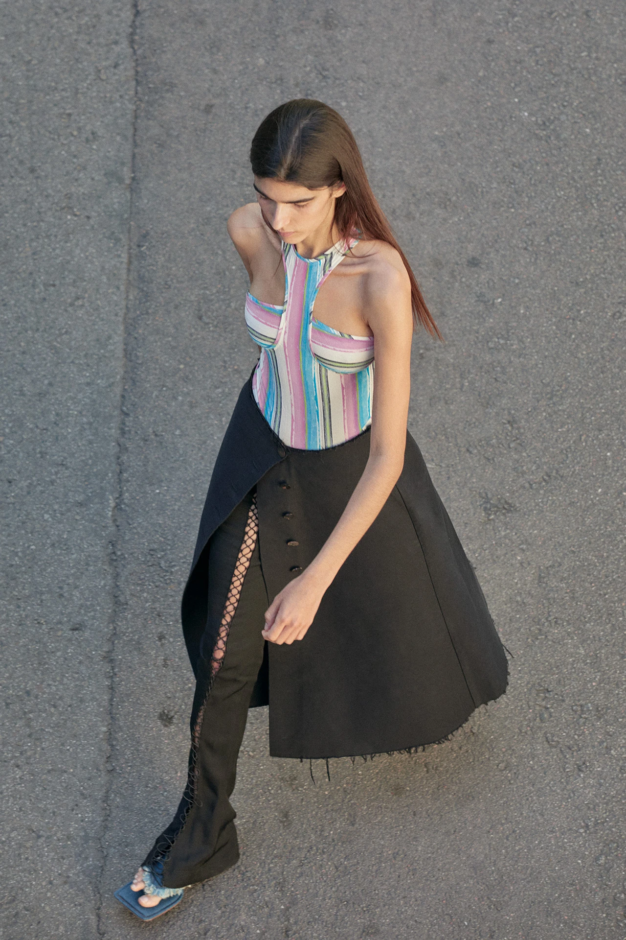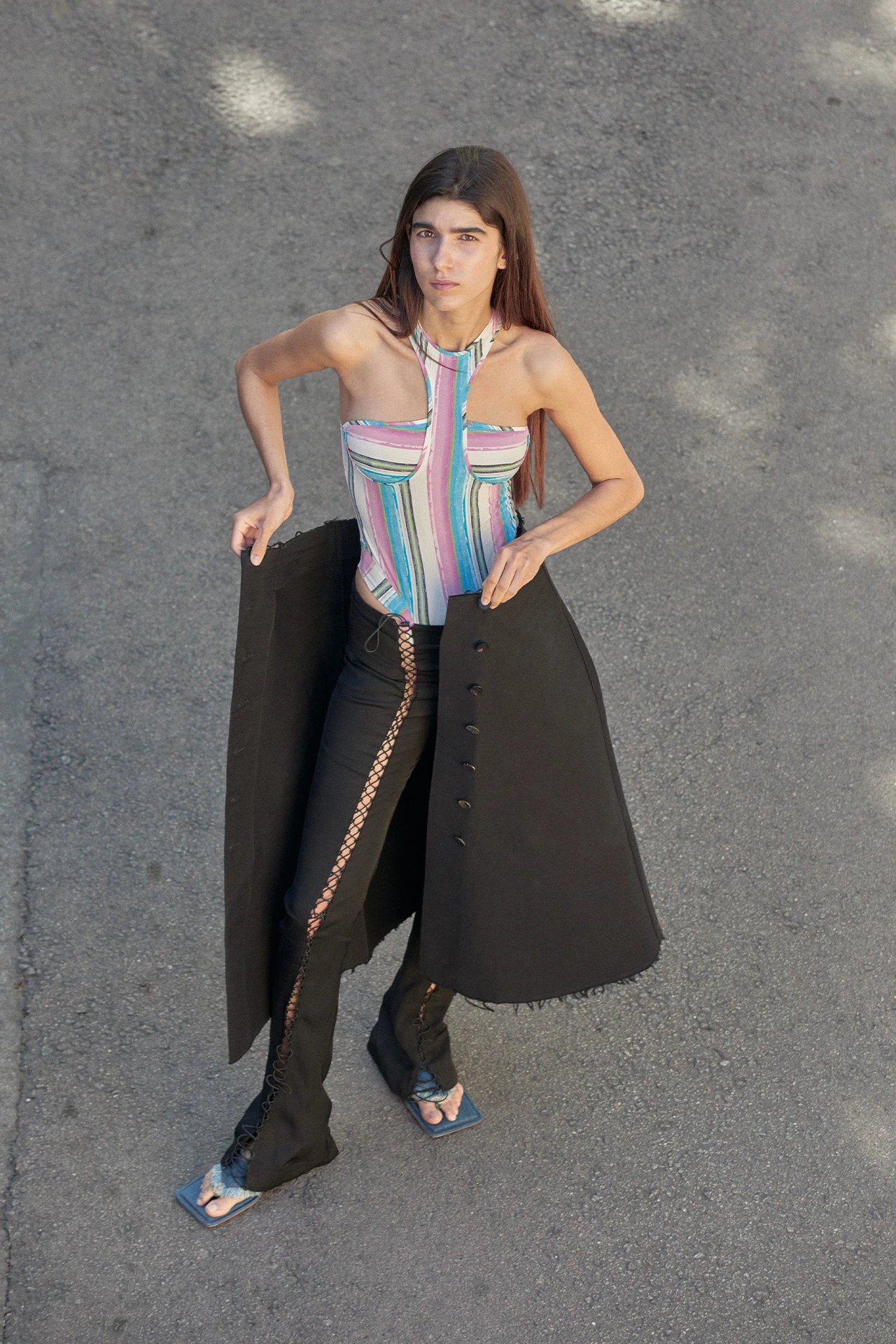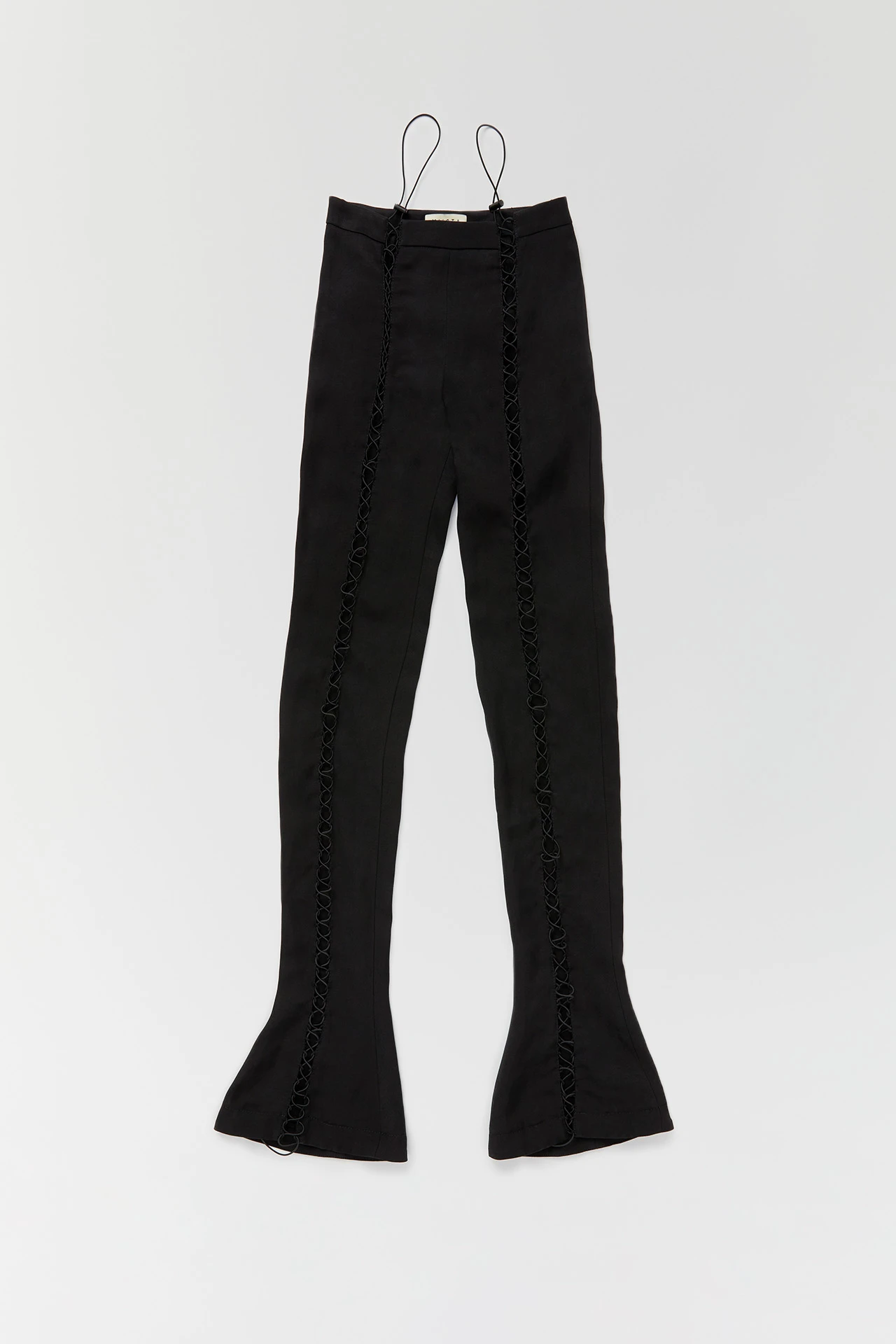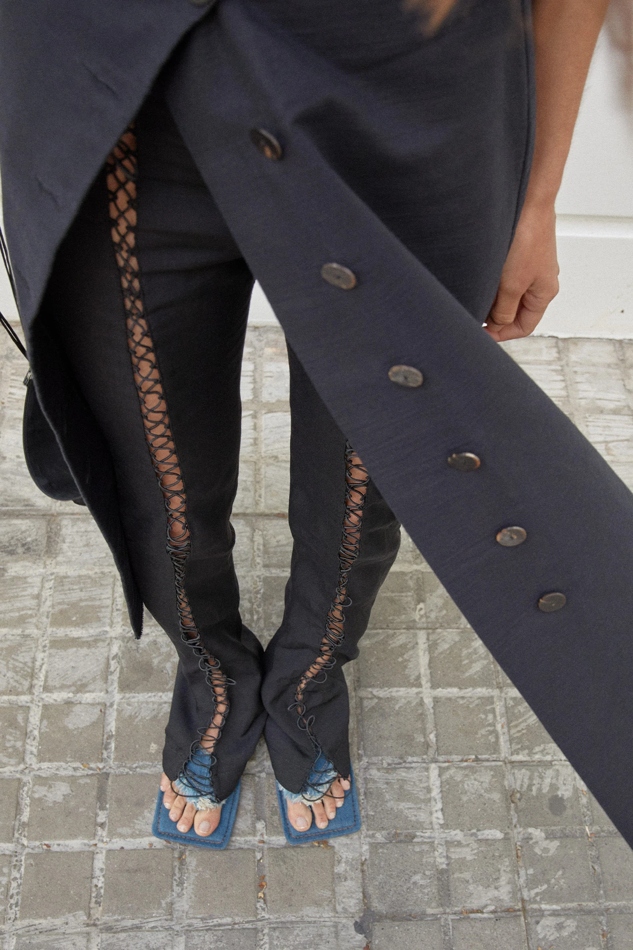 Tini ties up all your loose ends. In tight fit linen twill fabric, she runs up high to the waist and hugs the legs all the way to the floor – before fanning out in flares with pleasing inner slits as she hits the ankle. Crossed elastic lacing runs back up the front of each leg, meeting adjustable ring-pulls at the waistline. But her secret power lies at her rear, where Tini’s removable bumbag sits comfortably just above yours.