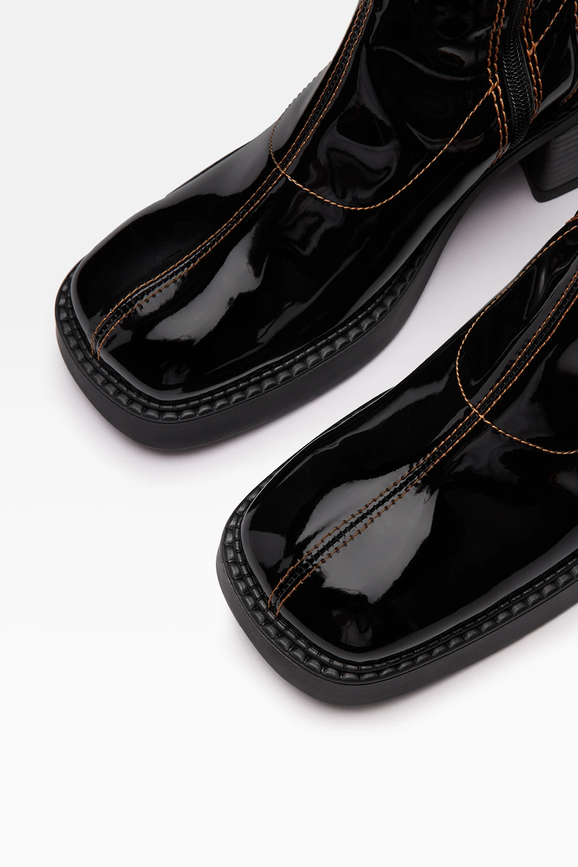 Vero is a mid-century icon transformed for the present day. Her black patent leather upper glints in the darkness, reaching up to the mid-calf and revealing glimmers of warm contrast stitching to unite her panels. Her sole features a very slight platform, bridging the gap between the pavement and her stacked mid heel.
