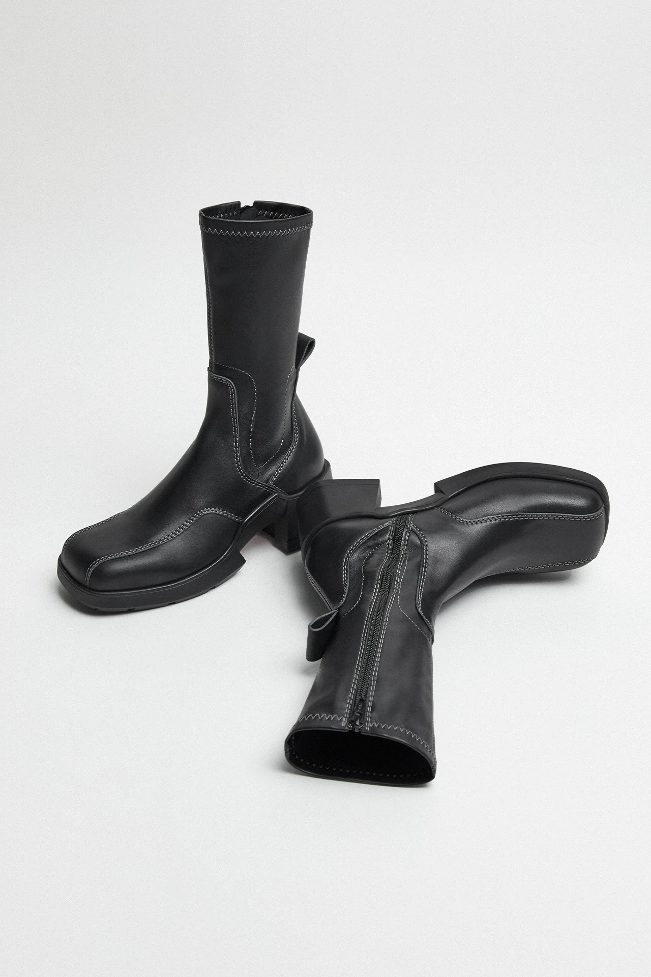 Viken is a seasonal icon, created to transform and elevate. Her sleek, sock outer reaches to the mid-calf, joined by the playfulness of contrast white stitching and curved panels. A boot pull tab sits above her heel and her sole is lifted on a 6cm platform.