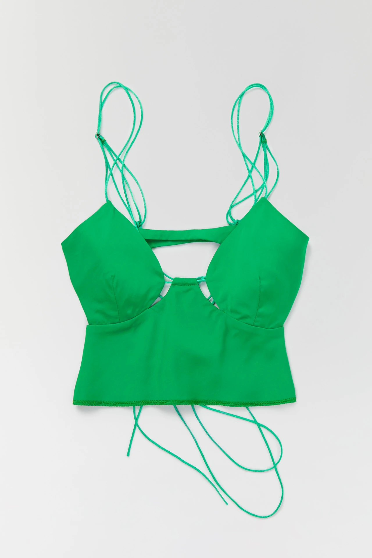 This is Yang – she’s one of those tiny little tops that you have to force yourself not to wear every single time the sun comes out. And even when it’s not out, you find excuses to layer her over something else. Formed of silky viscose, she’s got a close-fitting bodice that meets soft cups halfway, forming pleasing negative space at the centre of the chest. Laced straps in a contrasting shade of green run across the shoulders, crossing and tying at the back for an adjustable fit.