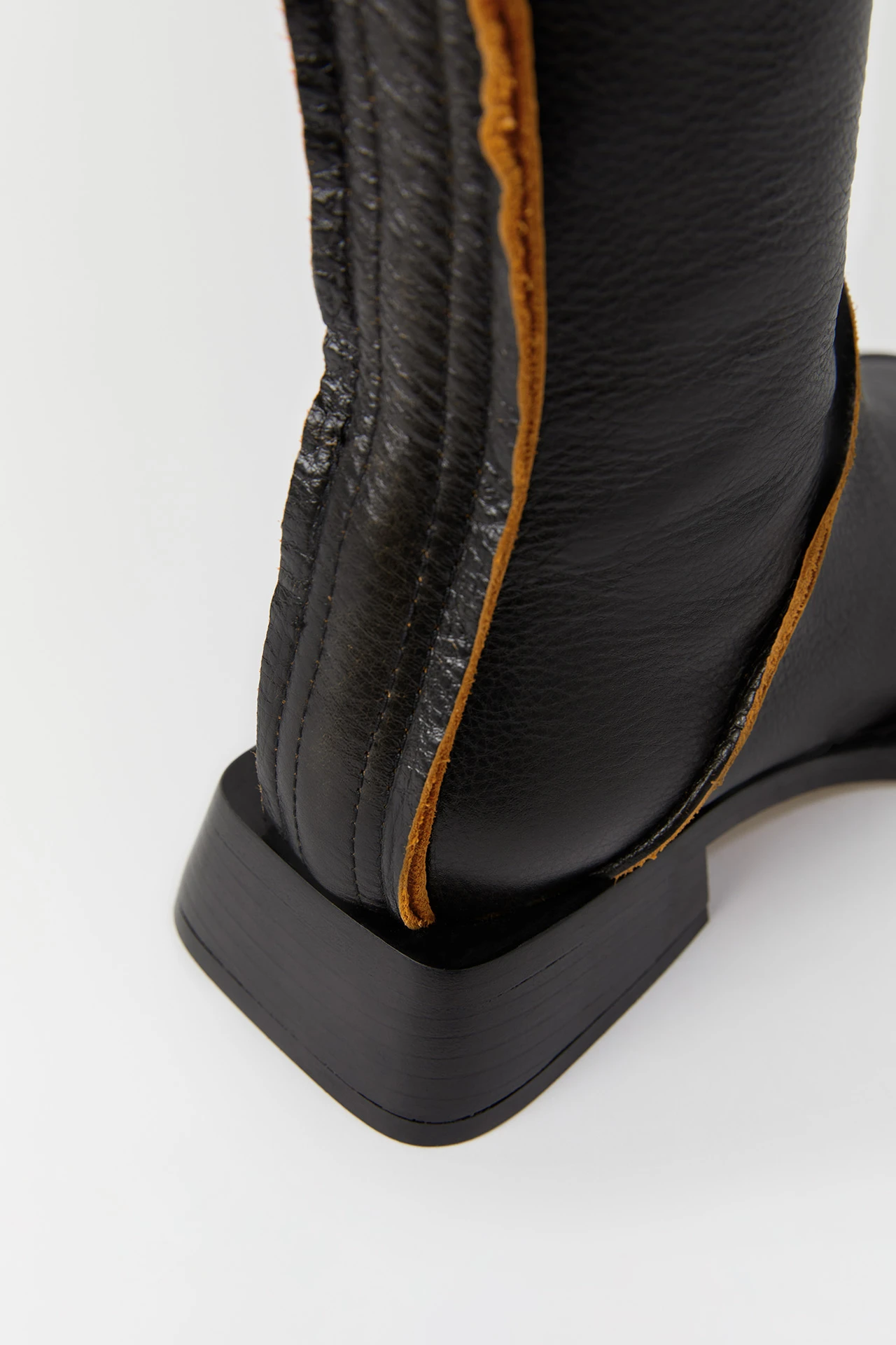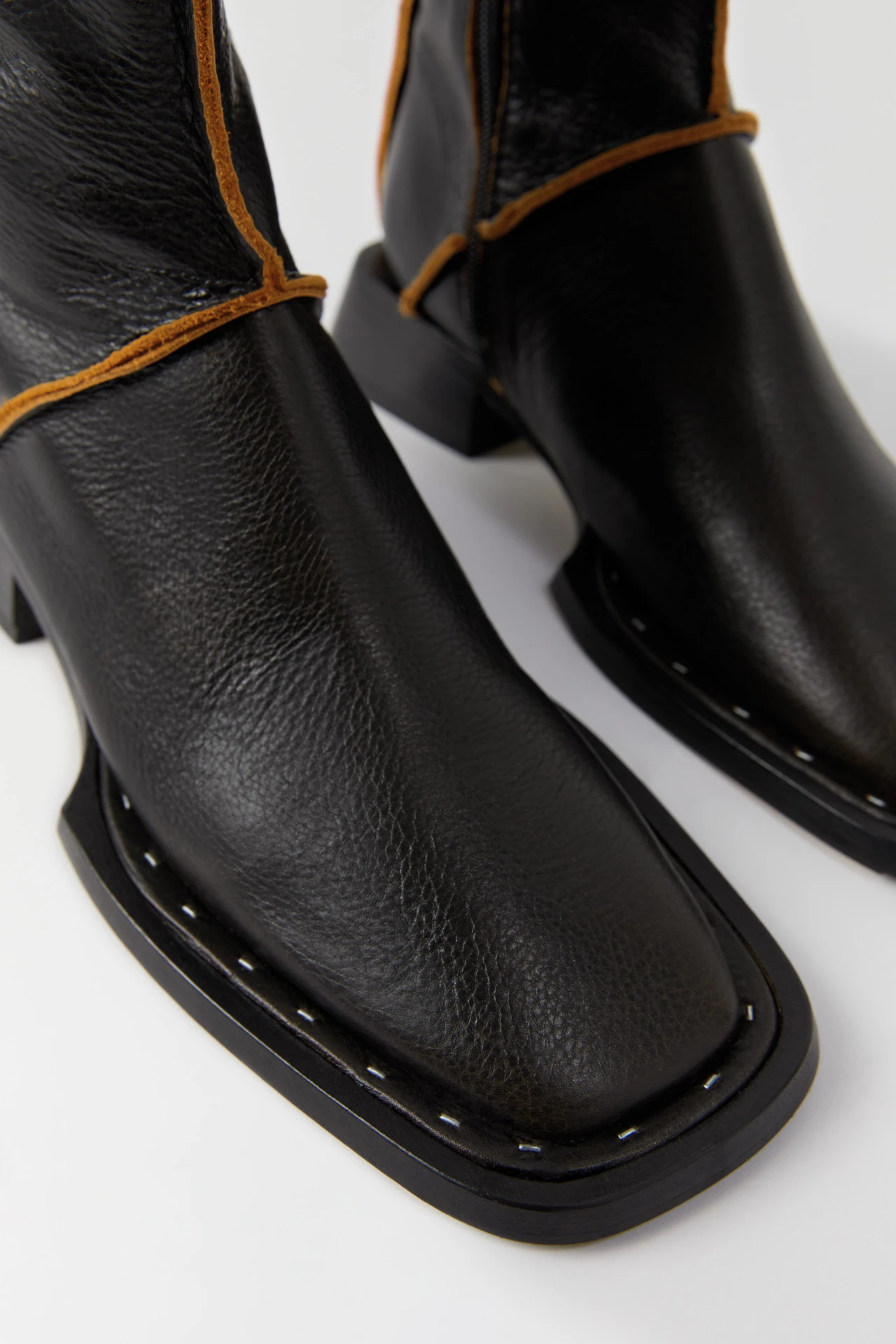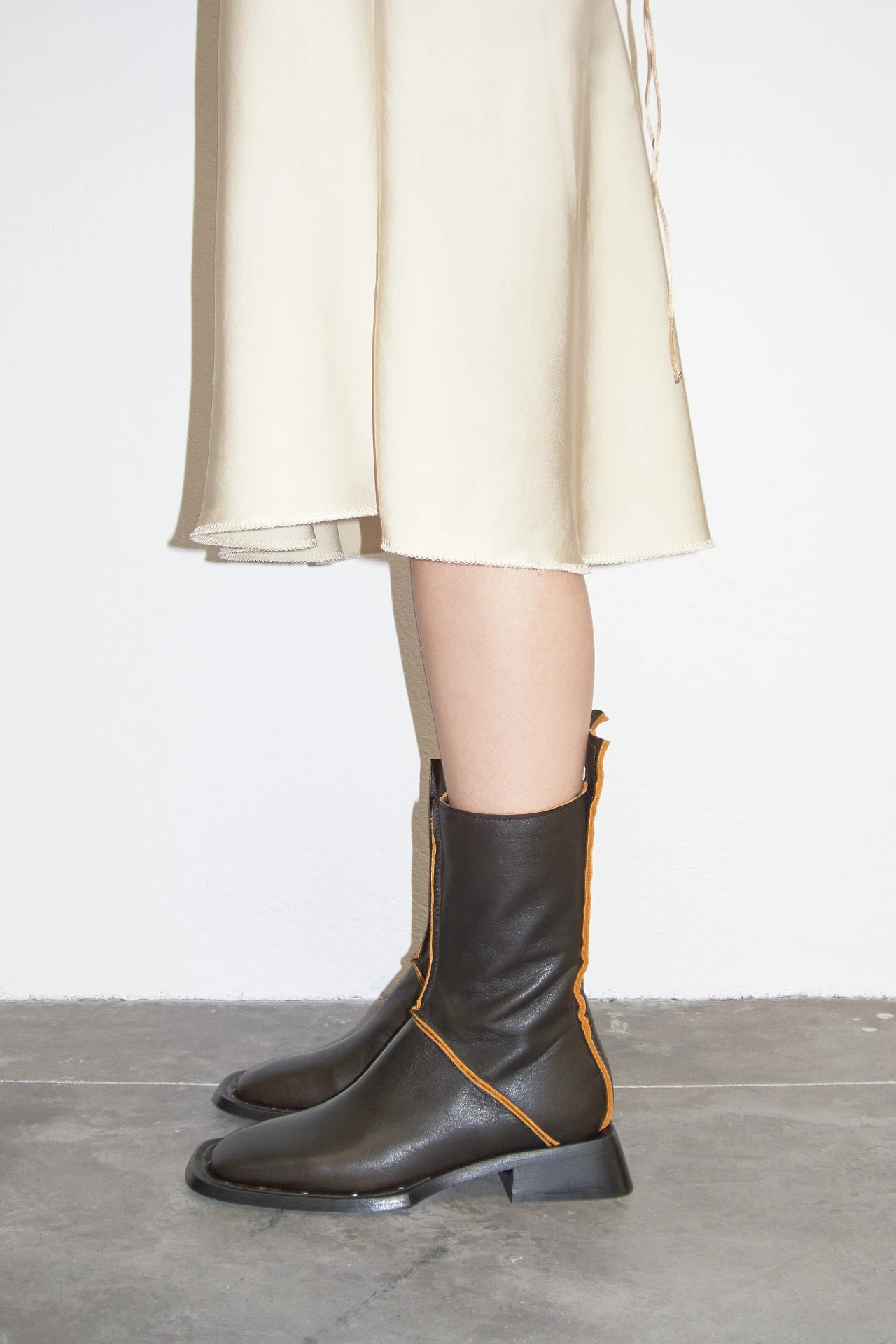 A boot with industrial influences, the upper features angular patterns crafted from a soft brown leather with an orange interior revealed through thick contrasting raw edges. Featuring an angular stacked leather heel and oversized sole finished with a doubled welt and metal staples.