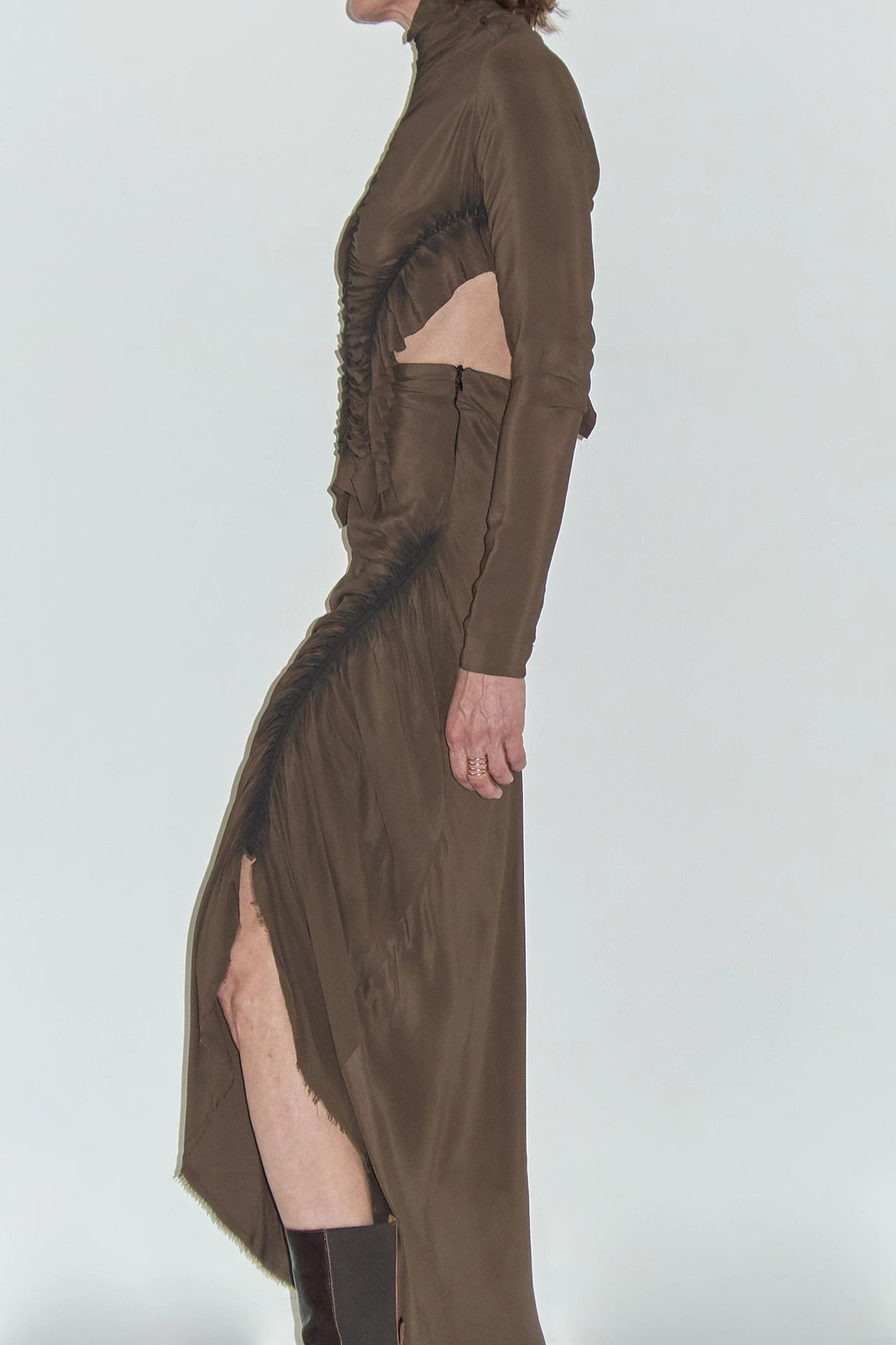 Ze’s a smooth, slinky staple that cuts a fine figure. She hugs the hips before flaring out slightly into a longline skirt – but a ruched seam to one side raises her up, creating a slit-like effect to reveal your legs and shoes beneath.