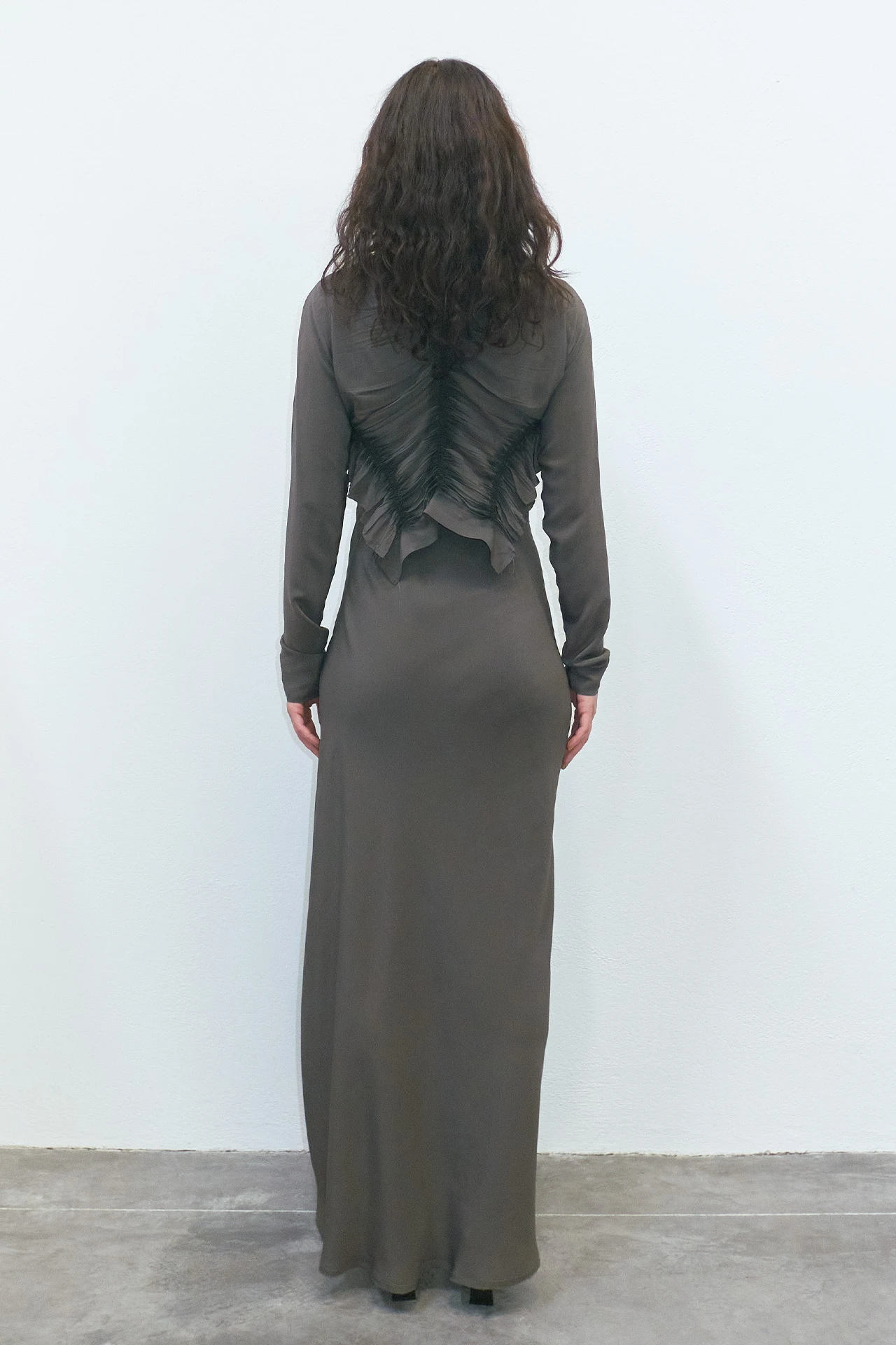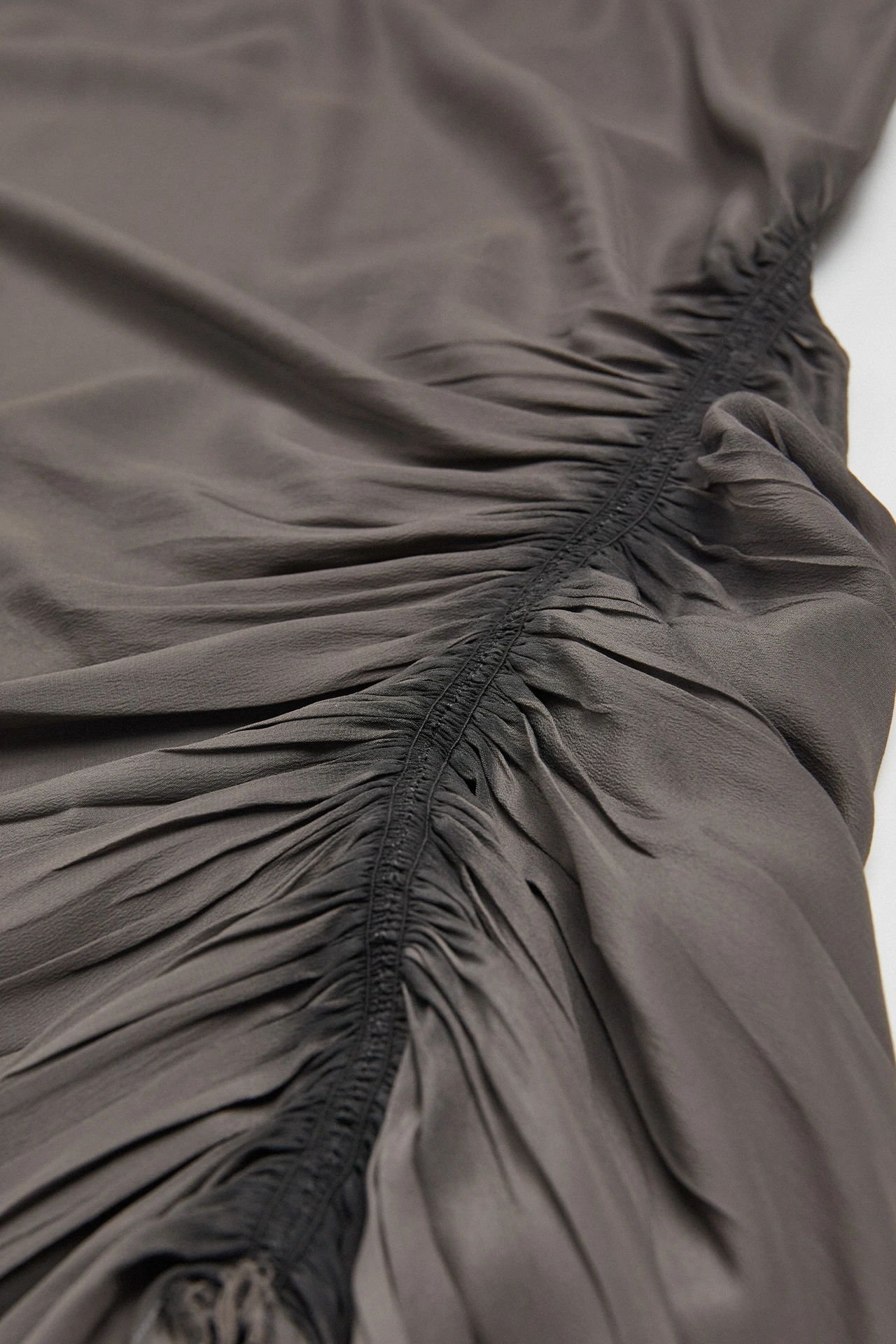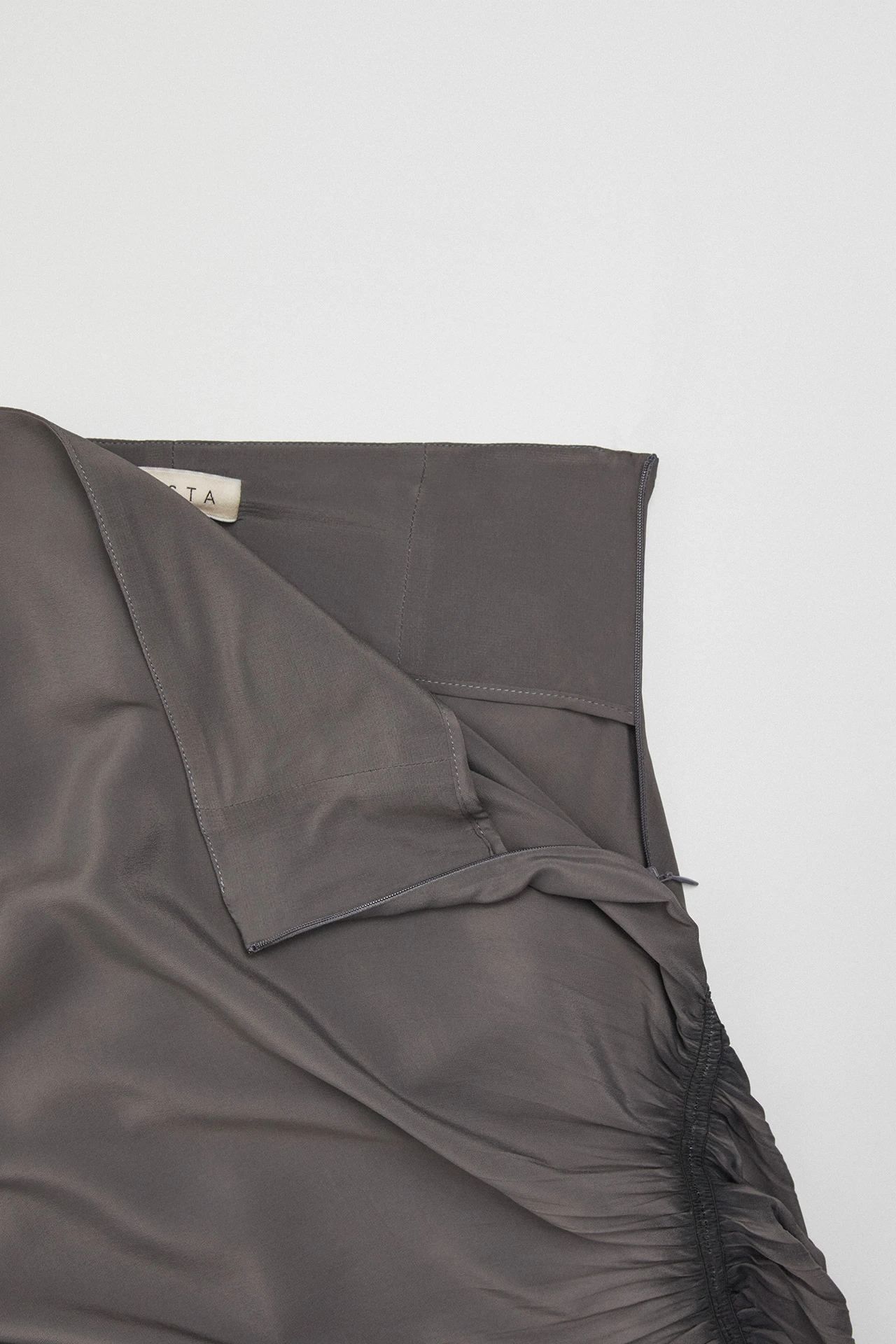 Ze’s a smooth, slinky staple that cuts a fine figure. She hugs the hips before flaring out slightly into a longline skirt – but a ruched seam to one side raises her up, creating a slit-like effect to reveal your legs and shoes beneath. Â