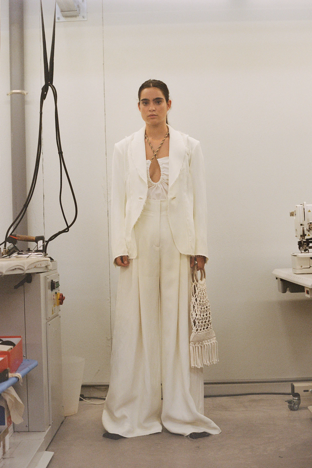 Raw frayed edges and irregular rubberised buttons upend the classic tailoring of Zenda, a lightweight unlined blazer crafted from white suiting twill. Wide dropped shoulders and gently voluminous sleeves are reined in by a darted waist and slim cuffs.